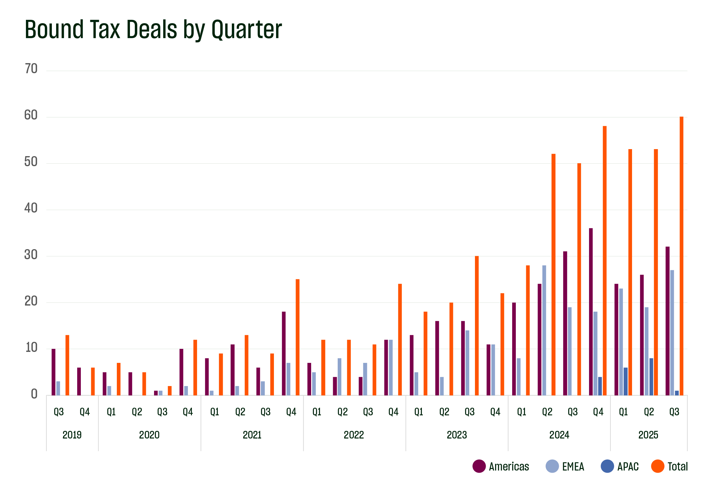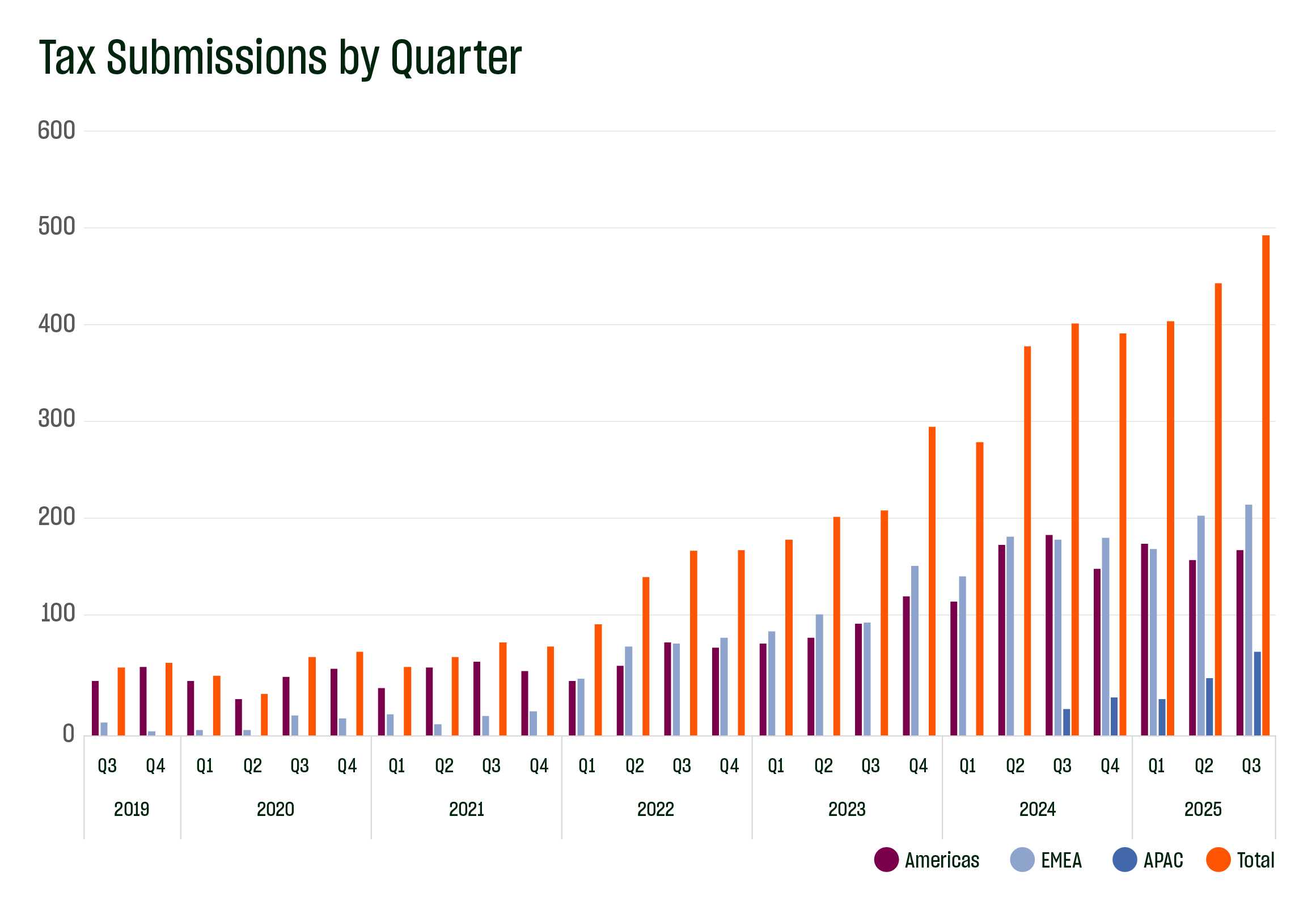 - 492 global tax submissions – 183 North America, 225 EMEA, 84 APAC – contributing to ~23% YoY growth (1,365 vs. 1,111).