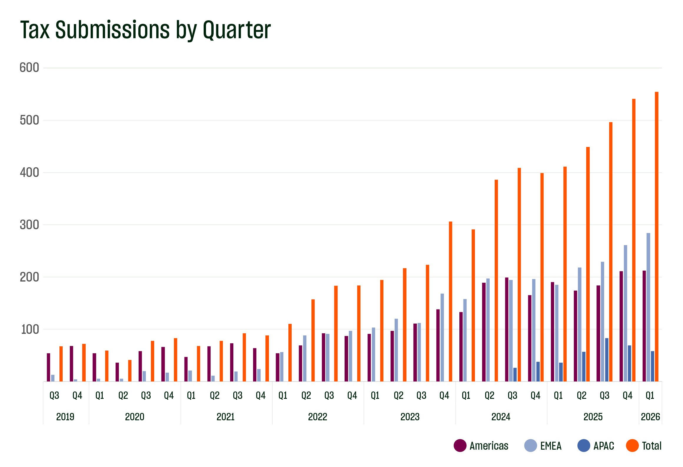 - EMEA led all regions with a quarterly record 284 submissions, a meaningful increase from 190 in 1Q25, driven in large part by cross-border M&A, internal reorganizations, and what we believe to be concerns regarding heightened scrutiny of tax authorities.
